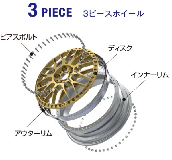 アウターリムとインナーリムをディスクと組み合わせてピアスボルトで組み付けるという三位一体構造です。