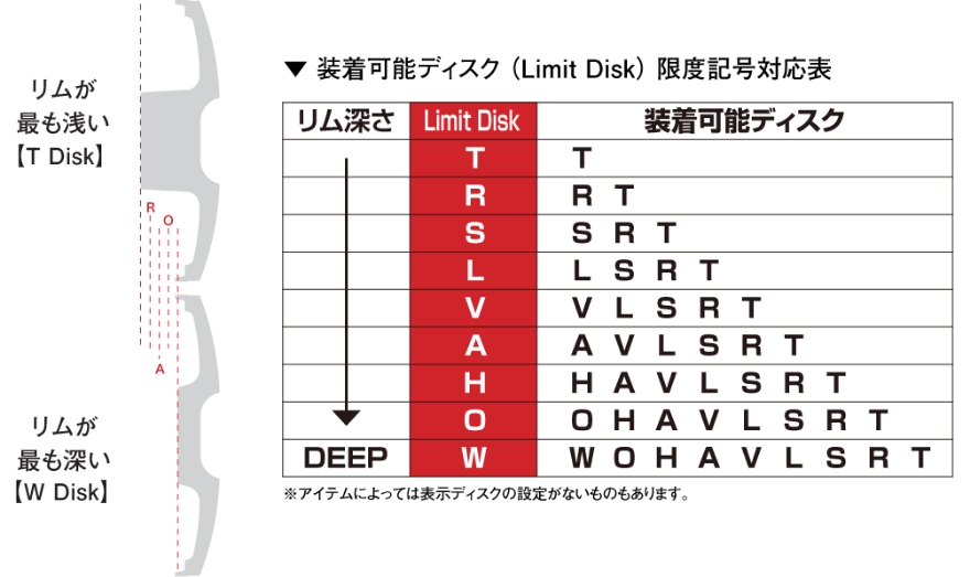 ワークのディスクは、R、A、Oを基準としていますが、商品によってはそれ以外のディスク形状もラインアップされており、取付面の高いものから順にT〜Wまでの合計9種類があります。 ビッグキャリバーを装備していなくとも、選んだホイールサイズやディスク形状によっては、キャリバーと干渉してしまう恐れがあるので、 それを防ぐため、「ワークマッチング検索」中に「Limit Disk」を表示しています。 「Limit Disk」として表示されているディスク形状よりもリムの浅いディスクなら、キャリバーと干渉することなく装着することが可能です。