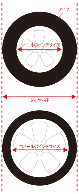 ただし、インチアップの際に注意しなければならないのが、外周サイズ。 純正ホイールとタイヤが組み合わさった状態におけるタイヤ外周サイズを遵守しなければいけません。 外周サイズが狂うと、速度計や距離計の表示が狂ったり、操縦安定性にも支障をきたしたりする恐れがあるためです。
