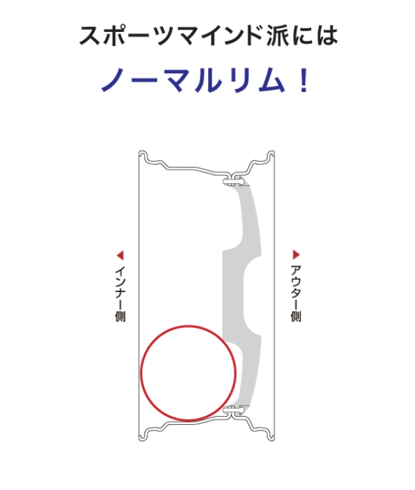 ノーマルリムは、ホイールの基本となる構造です。インナー側のスペースが広くなっており、よりディスクローター径の大きいブレーキ装着車に有利です。 特にスポーツ系車両にオススメです。タイヤはアウター側から組み込みます。