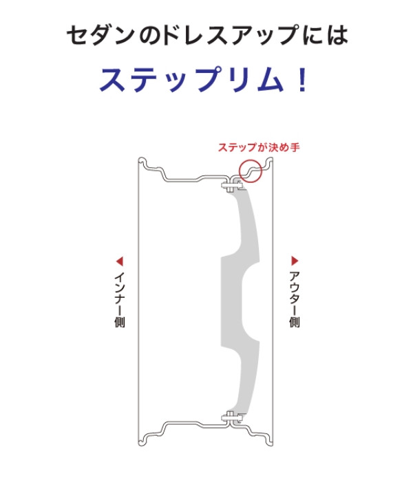 ステップリムは、リバースタイプでありながら、アウター側に施されたステップデザインが特徴的なリム構造です。フルリバースリムにノーマルリムの特徴を付け加えた形です。 セダン・ミニバン問わず様々な車両にオススメです。ステップリムはセミリバースリムとも言います。タイヤはインナー側から組み込みます。
