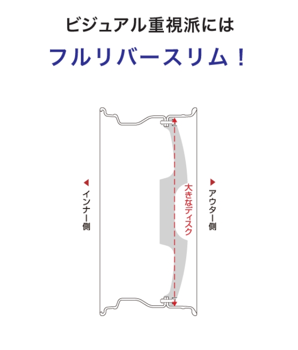 ノーマルリムを逆(リバース)にした構造がフルリバースリムです。ディスク面が大きくとれる構造になっている為、同じインチでもノーマルリムと比べアウターリムがフラットになることから、より大口径に見せることが可能です。セダン・ミニバン問わず様々な車両にオススメです。タイヤはインナー側から組み込みます。