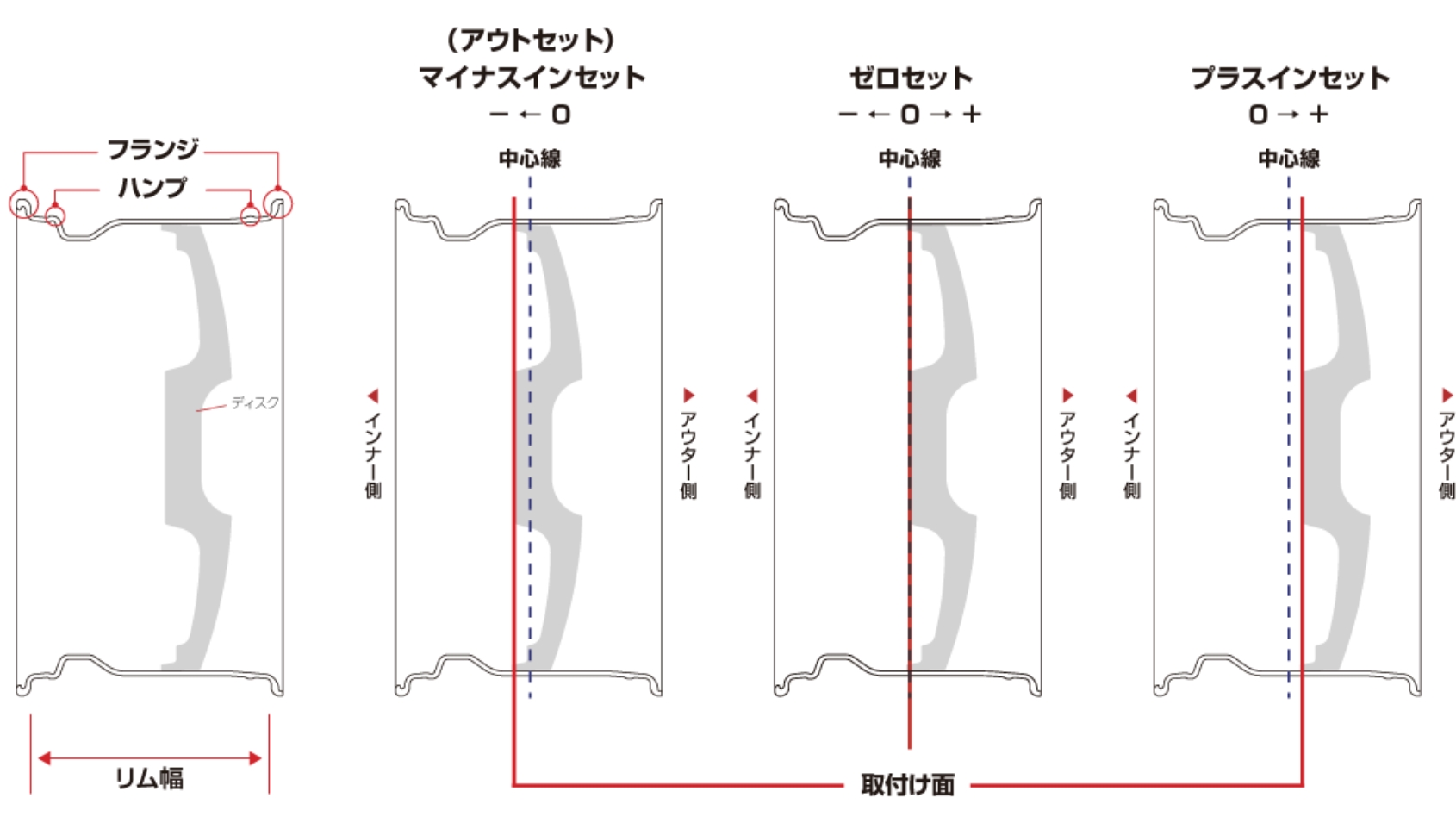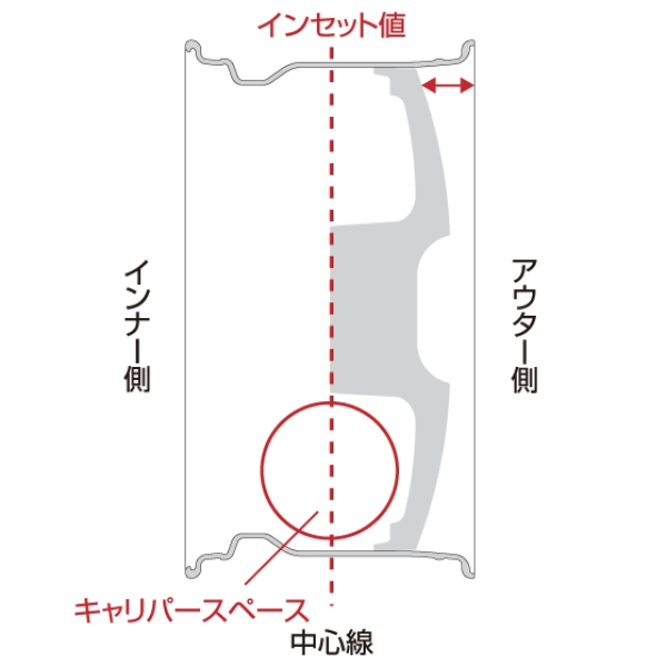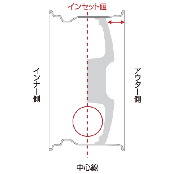 インセットとは、「リムの中心」と「車体への取り付け面(ディスク部)」の距離を示した数値です。 (単位はmm)リムの中心より取り付け面がアウター側なら「プラス(+)インセット」、インナー側なら「マイナス(-)インセット=アウトセット」になります。 インセットがプラス(+)になるほどホイールは車体の内側へ入り、マイナス(-)になるほど車体の外側へ出ていきます。