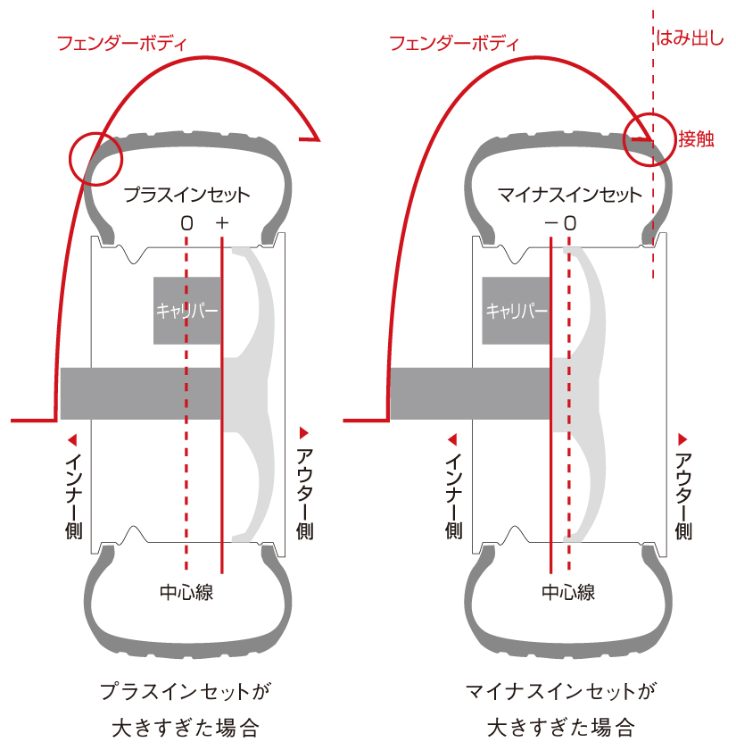 リム幅が決まると次のポイントは、インナー側にあるキャリバー(ブレーキ部品)や、アウター側にあるフェンダーとの関係。 あまりにもプラスインセットの大きいホイールであればフェンダー内側に干渉してしまい、 逆にマイナスインセットの大きいホイールであればフェンダーに接触したり車体からはみ出てしまいます。 タイヤやリム面がフェンダーからはみ出すと道路交通法違反となるため、インナー側とアウター側のバランスを良く考えた上で、ベストインセット値を割り出します。
