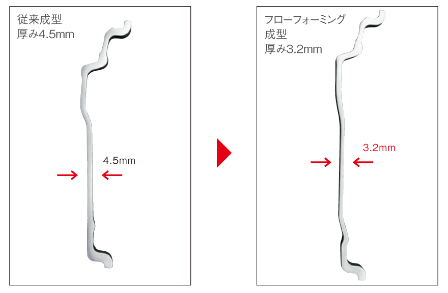 WORK EMOTION CR kiwamiを筆頭にインナーリム部の成型は、鋳造完了した素材のリム部分に「圧力」をかけながら伸ばして成型するフローフォーミング製法を採用。 この製法で、より鍛えられたアルミのマクロ組織が微細化することでしなやかさが増し、 さらにリム部板厚の薄肉化による軽量化がプラスされることで鍛造に迫るメタルフローの実現に成功。 インナーリムに要求される「引っ張り強度」や「粘り強さ」を飛躍的に高めている。 同時に、アウターリム部も耐衝撃性に優れた設計にすることで従来の鋳造ホイールの性能を大きく飛躍させている。